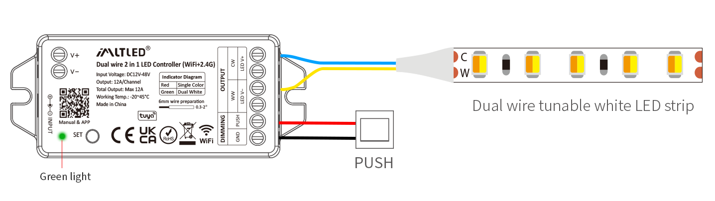 For tunable white LED strip (short press “SET”–green indicator)