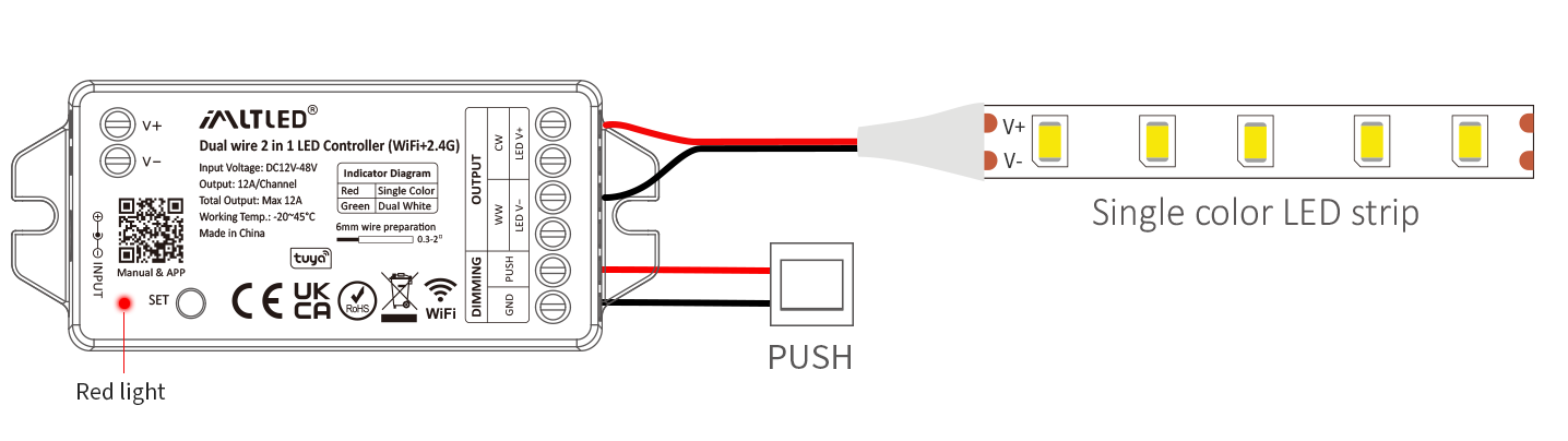 - 2 kinds of output mode support 2 LED strip (Single color/Tunable white).